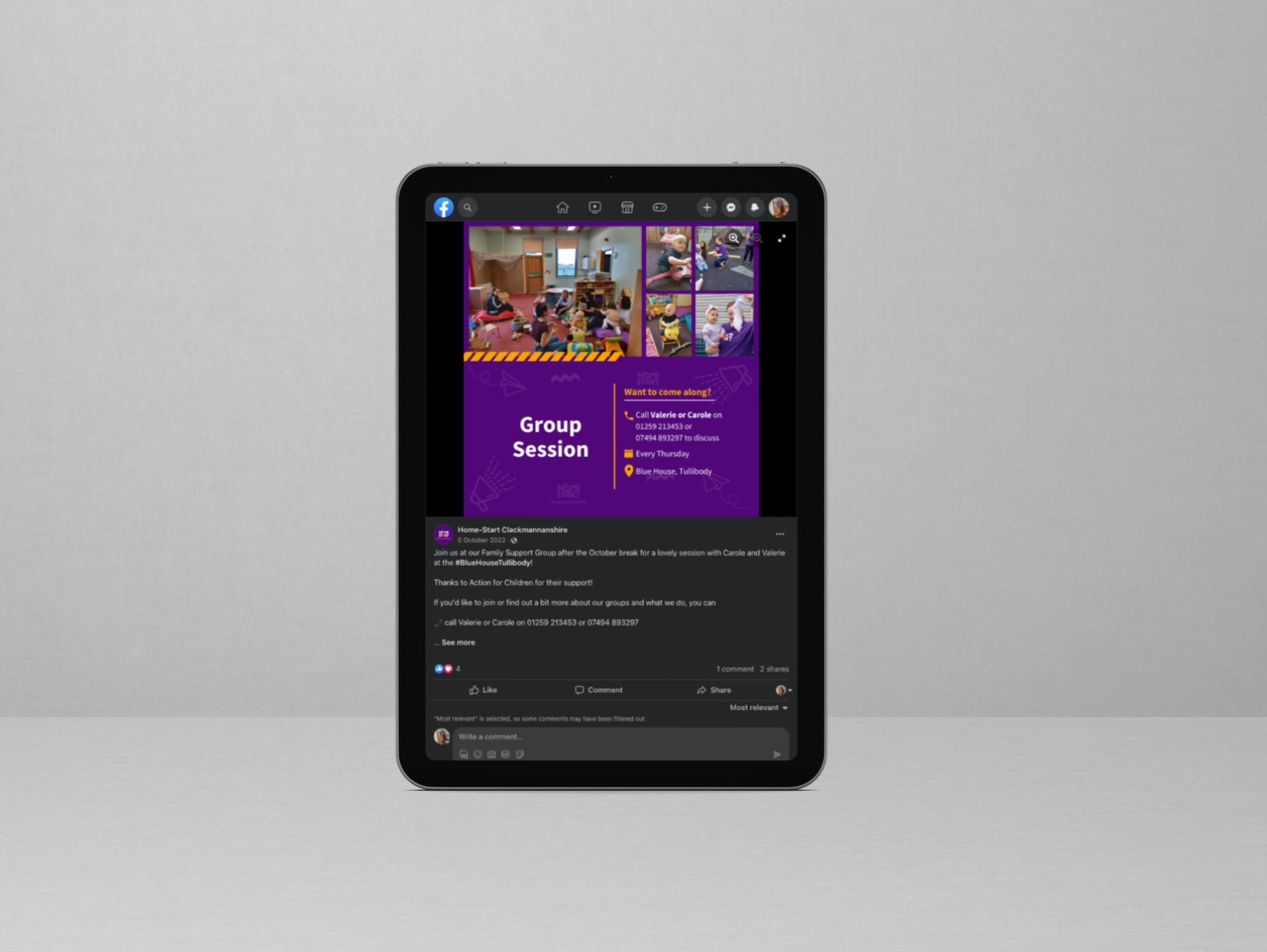 back Digital Communications Consultant Home-Start Clackmannanshire Organic Social Media Promotion - Family Support Groups I was asked to promote the charity’s weekly family support groups to encourage shy parents to consider coming along.